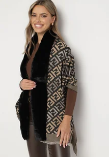 Czarno-Beżowe Wiskozowe Ponczo w Geometryczny Wzór z Futerkową Wstawką Miarella