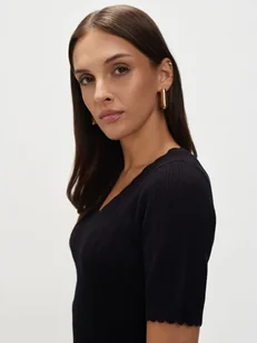 Stylowy czarny ażurowy sweter to doskonały wybór dla osób ceniących klasykę z nowoczesnym akcentem. Delikatna ażurowa tekstura nadaje mu lekkości i elegancji. Stylowa faktura oraz podkreślone detale dodają mu wyjątkowego charakteru, czyniąc go idealnym dodatkiem do wielu stylizacji.