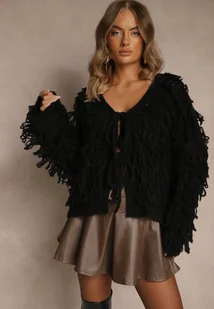 Czarny Wiązany Kardigan z Dodatkiem Wełny i Wiskozy Zdobiony Frędzlami Tiravea