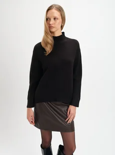 Czarny sweter z rozcięciem z tyłu to elegancki element garderoby, idealny na chłodniejsze dni. Wykonany z miękkiego materiału, zapewnia komfort i ciepło. Klasyczny krój z długimi rękawami sprawia, że jest uniwersalny i łatwy do łączenia z innymi elementami garderoby. Rozcięcie z tyłu dodaje mu nowoczesnego charakteru i sprawia, że ten sweter staje się wyjątkowy. Idealny zarówno na co dzień, jak i na bardziej formalne okazje.