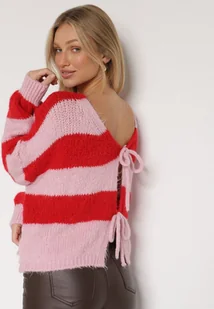 Czerwony Wiązany Kardigan Oversize w Paski z Dodatkiem Wełny i Wiskozy Retire
