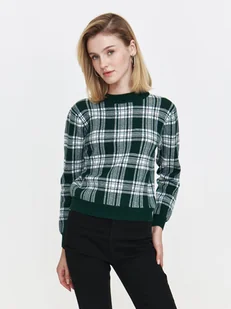 Urzekający dużym komfortem podczas użytkowania sweter damski z praktycznym szerokim ściągaczem u dołu. Posiada on okrągły dekolt wzbogacony wokół szeroką i delikatnie marszczoną lamówką oraz proste długie rękawy zakończone praktycznym ściągaczem. Wykonany on został z przyjemnej w dotyku oraz ciepłej dzianiny z nadrukiem w efektowną kratę na całości. Świetnie prezentuje się on zarówno w połączeniu z klasycznymi spodniami jeansowymi, jak i również efektowną spódnicą. Sweter damski dostępny w kolorze zielonym TSKW24SWE377377X00.