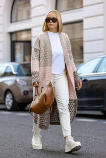 długi kardigan o luźniejszym kroju materiał grubszy, miękki dopasowane rękawy zakończone ściągaczem dwie wplecione kieszenie piękne połączenie trzech kolorów: beż, kakao i puder róż Skład: Akryl 55%, wełna 18%, poliester 10%, elastan 10%, poliamid 7% Produkcja: Polska Wymiary w cm góra: Szerokość 60 Długość 119