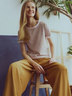 Sweter damski Top Secret z krótkim rękawem. Urzekający swym niebagatelnym designem oraz dużą wygodą podczas użytkowania, sweter damski o dopasowanym fasonie, który dokładnie przylega do kobiecej sylwetki i eksponuje jej walory. Posiada on krótkie rękawy wzbogacone ozdobnymi złotymi guzikami po zewnętrznej stronie oraz szeroką ozdobną lamówką. Uroku dodają mu delikatne poprzeczne paski na całości oraz efektowny okrągły dekolt wraz z szeroką lamówką wokół. Wykonany on został z przyjemnej w dotyku oraz dobrej gatunkowo dzianiny z dodatkiem wiskozy, sprawdzając się doskonale w stylizacjach zarówno z klasycznymi długimi spodniami, jak i również spódnicą.