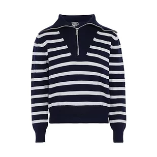 Dreimaster maritim Damski sweter z dzianiny w paski z zamkiem błyskawicznym i granatowym dekoltem, granatowy, wełniany, białe paski, rozmiar M/L, Ciemno-granatowe białe paski, M