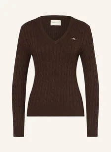 Warkoczowy splot. Prosty krój. Dekolt w serek. Prążkowane ściągacze przy rękawach i rąbku. Haft z logo na wysokości klatki piersiowej. Elastyczna bawełna