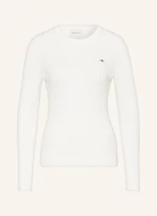 Warkoczowy splot. Prosty, dopasowany krój. Okrągły dekolt. Prążkowane ściągacze przy rękawach i rąbku. Haft z logo na wysokości klatki piersiowej. Elastyczna bawełna