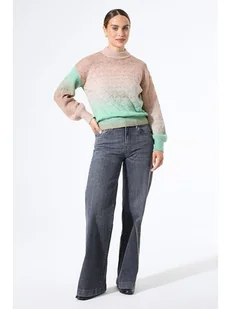 Sweter w kolorze beżowo-miętowym - kołnierz: stójka - ściągacz: kołnierz, zakończenia rękawów, dolny brzeg - detale: nakładane rękawki - wzor splotu: warkocz - krój:prosty - wzór: przejście kolorów