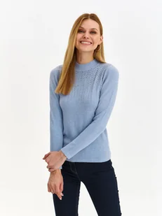 Sweter dostępny w kolorze błękitnym SGO0264BL. Modelka ma 176 cm wzrostu i prezentuje rozmiar 34.