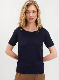 Sweter damski Top Secret w wersji z krótkim rękawem. Ceniony za wiele praktycznych możliwości codziennego wykorzystania, sweter damski o klasycznym prostym kroju w wersji z krótkim rękawem zakończonym delikatnym przeszyciem oraz wzbogaconym po zewnętrznej stronie o ozdobne złote guziki. Wykonany on został z dzianiny cechującej się miękkością oraz trwałością i ma efektowny okrągły dekolt wraz z szeroką lamówką wokół. Sweter dopasowuje się do kobiecej sylwetki i stanowi świetne uzupełnienie stylizacji zarówno z klasycznymi długimi spodniami, jak i również efektowną spódnicą, podkreślając niebywały urok oraz niecodzienny szyk. Sweter damski dostępny w kolorze granatowym TSKJ25SWE000159X00. Modelka ma 176 cm wzrostu i prezentuje rozmiar 34.