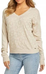 GUESS BEŻOWY SWETER DAMSKI Z DEKOLTEM V ZE WZOREM LOGO XS GMD