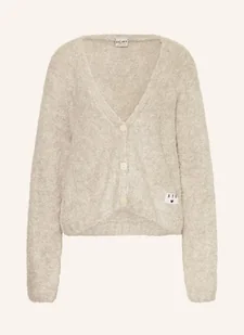 Gładki ścieg. Prosty krój. Dekolt w serek. Zapięcie na guziki. Zachodzące ramiona. Naszywka z marką z przodu. Z przędzy bouclé. Miękki w dotyku materiał