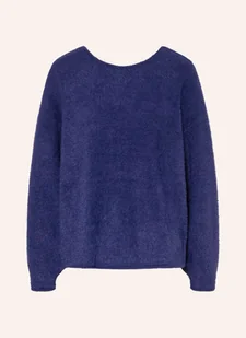 Gładki ścieg. Prosty krój. Okrągły dekolt. Dekolt w serek z tyłu. Krótka listwa guzikowa z zatrzaskami z boku. Rolowany rąbek przy rękawach i rąbku. Delikatny puch. Miękki w dotyku materiał