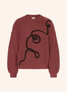Gruba dzianina. Prosty krój. Okrągły dekolt. Zachodzące ramiona. Prążkowane ściągacze przy rękawach i rąbku. Abstrakcyjny wzór zprzodu. Wyrazisty szew. Teksturowany materiał