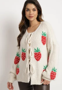 Jasnobeżowy Kardigan Wiązany z Domieszką Wełny i Wiskozy Ozdobiony Wzorem w Truskawki Cesiella