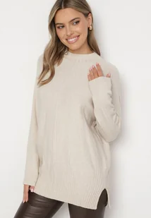 Jasnobeżowy Sweter z Półgolfem z Prążkowanej Dzianiny z Wycięciami po Bokach Rerivra