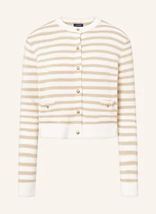 Gruba dzianina. Prosty krój. Okrągły dekolt. Zapięcie z metalicznymi guzikami. Nakładane kieszenie. Prążkowane ściągacze przy rękawach i rąbku. Wzór w paski