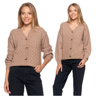Wzór: Klasyczny warkoczowy splot – dodaje tekstury i ponadczasowej elegancji. Luźniejszy krój – zapewnia wygodę noszenia i swobodę ruchów. Lekko bufiaste rękawy zakończone ściągaczem – dodają modnego akcentu. Głęboki dekolt w serek – idealny do eksponowania bluzek lub koszul. Zapięcie: Uniwersalne zapięcie na eleganckie guziki – wygodne zakładanie, pozwala nosić sweter otwarty lub zapięty.