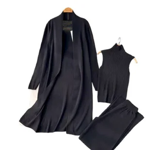 Kobiecy 3-Częściowy Czarny Zestaw Top Z Golfem Kardigan Spodnie Dzianinowe