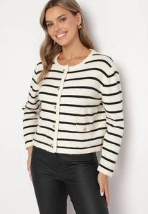 Kremowo-Czarny Rozpinany Kardigan z Kaszmirem w Paski z Imitacjami Kieszonkami Edrialla