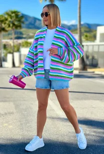 Krótki, lekki kardigan oversize w paski - niebo/baby róż One size