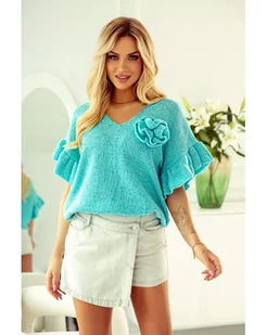 Krótki delikatny sweterek w idealnych kolorach na wiosnę. Uroku dodaje przyszyty z przodu kwiatek. Doskonale skomponuje się z jeansami, szortami oraz spódnicami. Mnóstwo wariantów kolorystycznych - znajdź kolor idealny dla siebie!
