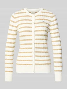 Kurtka z dzianiny damska Gant;Elastyczna bawełna mieszana;Dopasowany krój;Ścieg warkoczowy;Okrągły dekolt;Listwa guzikowa;Prążkowane wykończenia;Długość tyłu w rozmiarze S: 60 cm;Długość rękawa w rozmiarze S: 61 cm
