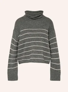 Gładki ścieg. Prosty krój. Stójka. Prążkowane ściągacze przy rękawach. Rolowane brzegi przy rąbku. Wzór w paski. Puszysty w dotyku materiał. Z wełny