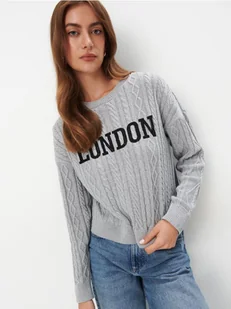 Szary sweter z napisem. Posiada długie rękawy i okragły dekolt