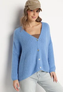 Niebieski Kardigan z Dekoltem w Serek z Dzianiny z Wełną i Moherem Lismio