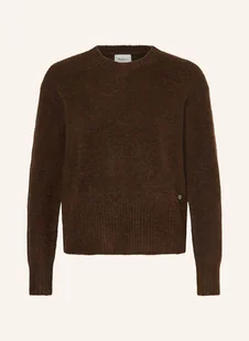 Gładki ścieg. Prosty krój. Okrągły dekolt. Zachodzące ramiona. Prążkowane ściągacze przy rękawach i rąbku. Detal z marką na rąbku. Delikatny puch. Miękki w dotyku materiał