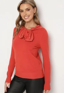 Pomarańczowy Prążkowany Sweter z Wiskozą Zdobiony Cyrkoniami i Wiązaniem Maltinnia