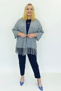 Popielaty Długi Kardigan Narzutka z Frędzlami L/XL Wymiary Rozmiar S/M Długość całkowita 78 cm Obwód biustu 130 cm Obwód bioder 130 cm Rozmiar L/XL Długość c...