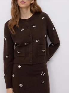 Kardigan o prostym kroju, wykonany z dzianiny z domieszką wełny.