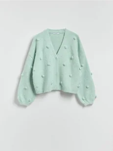 Kardigan o prostym kroju, wykonany z dzianiny z domieszką wełny.