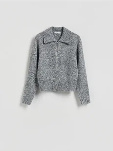 Kardigan o prostym kroju, wykonany z dzianiny z domieszką wełny.