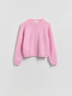 Sweter o prostym kroju, wykonany z dzianiny z moherem i wełną.