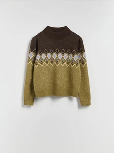 Sweter o prostym kroju, wykonany z dzianiny z domieszką wełny.