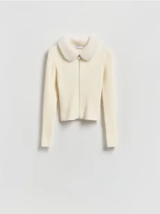 Reserved - Sweter z futrzanym kołnierzem - kremowy