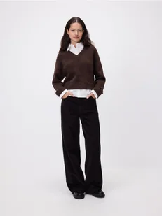 Sweter o skróconym kroju, wykonany z dzianiny z domieszką wełny.