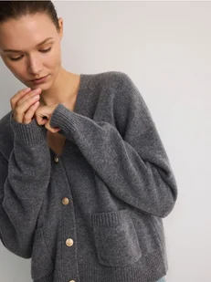 Kardigan o swobodnym fasonie, wykonany z wełnianej dzianiny.