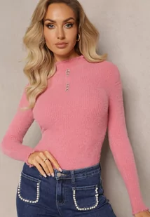 Różowy Futerkowy Sweter z Wełny z Półgolfem i Ozdobnymi Guzikami Zekluna