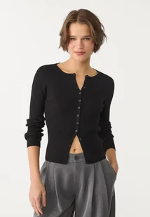 Dopasowany kardigan z prążkowanej dzianiny z długim rękawem, okrągłym dekoltem i zapięciem na guziki z przodu. Dostępny w różnych kolorach.