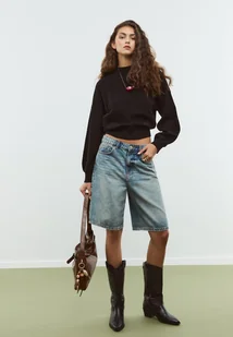 Sweter z dzianiny z podwyższonym kołnierzem i długim rękawem z bufiastymi ramionami, zakończony elastycznymi mankietami. Dostępny w różnych kolorach.