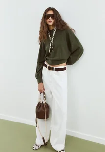 Sweter z dzianiny z podwyższonym kołnierzem i długim rękawem z bufiastymi ramionami, zakończony elastycznymi mankietami. Dostępny w różnych kolorach.
