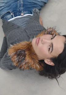 Sweter z kołnierzem z klapami ze sztucznego futra w kontrastowym kolorze i długim rękawem. Zapięcie na guziki z przodu.