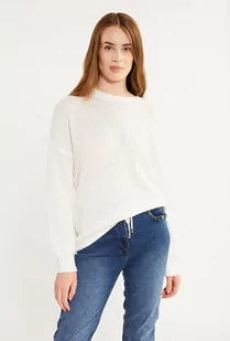 Sweter damski z wiązaniem, długim rękawem oraz półokrągłym dekoltem. Brzegi swetra wykończone ściągaczem. Model ten występuje w wielu wariantach kolorystycznych i świetnie sprawdzi się w codziennych stylizacjach. Modelka na zdjęciu ma 177 cm wzrostu i prezentuje rozmiar 36.