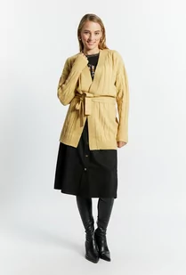Sweter damski typu kardigan wykonany z przyjemnego w dotyku materiału. Sweter z ciekawym splotem oraz długim rękawem. Dodatkowo na linii talii ma wiązanie, które świetnie podkreśli sylwetkę. Model ten z pewnością dopełni jesienne stylizacje. Modelka na zdjęciu ma 177 cm wzrostu i prezentuje rozmiar S.