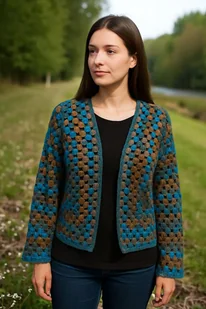 Ten piękny kardigan to ręcznie wykonana narzutka na szydełku w odcieniach turkusu, brązu i szarości. Zachwyca klasycznym wzorem i oryginalnym doborem barw, które tworzą wyjątkowy, harmonijny efekt. Materia ...