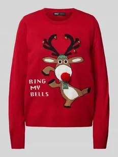 ONLY Damski sweter bożonarodzeniowy z dzianiny, renifer z dzwoneczkiem, Boże Narodzenie, High Risk Red/Reindeer Bells, M